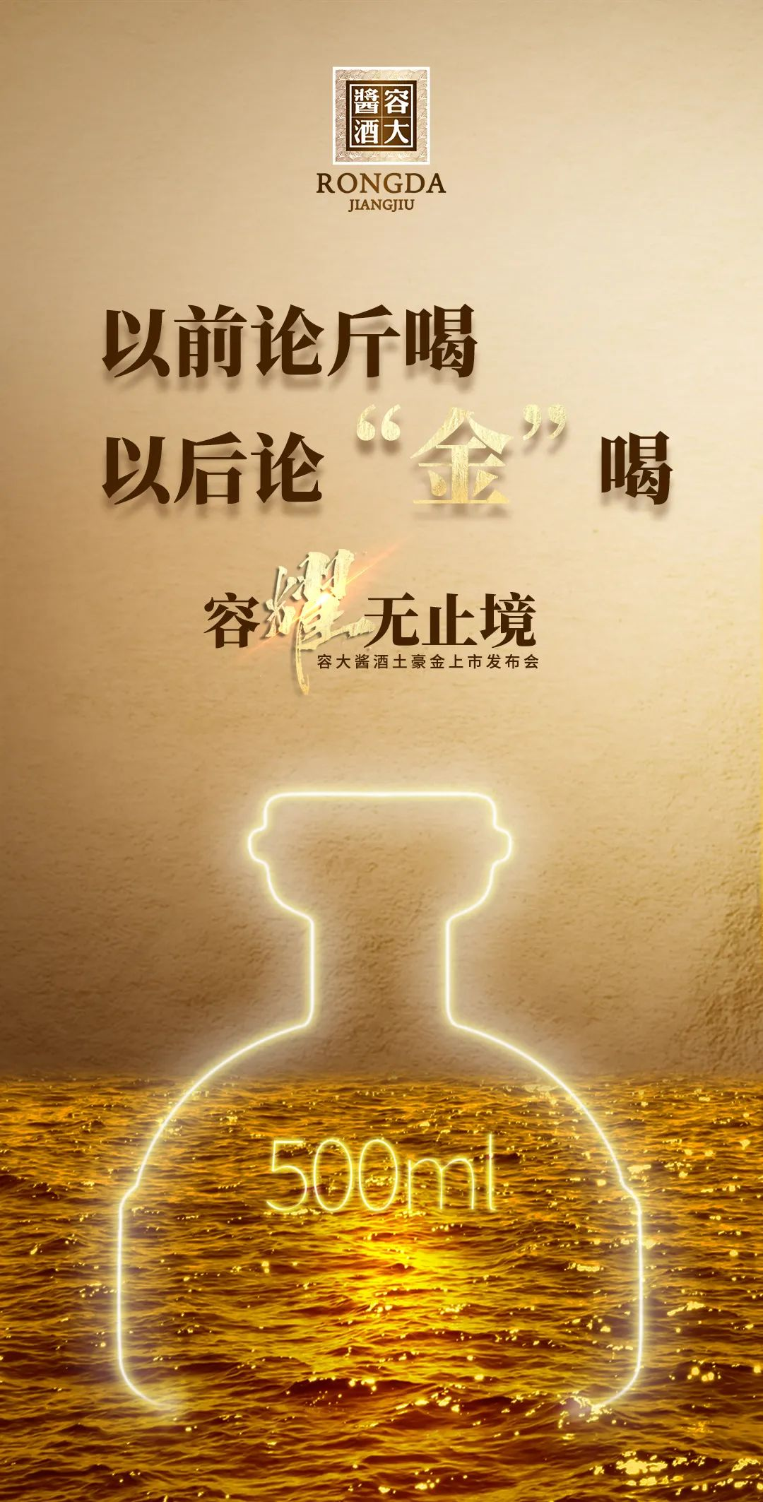 這是容大醬酒的手筆。4月下旬,容大醬酒戰(zhàn)略新品即將上市。樸實(shí)的宣傳語,透露出其口糧醬酒的市場(chǎng)定位;奢華的土豪金顏色,又給人無限遐想,讓人對(duì)其品質(zhì)有了更多期待。