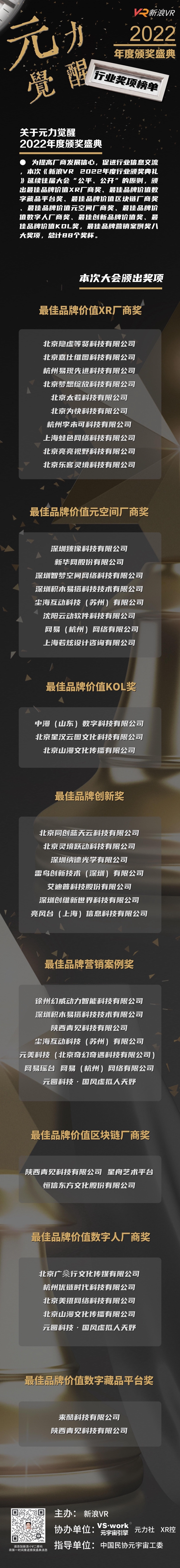 為提高廠商發(fā)展信心,促進(jìn)行業(yè)信息交流,本次《新浪VR 2022年度行業(yè)頒獎(jiǎng)典禮》延續(xù)往屆大會(huì)“公平、公開”的原則,頒出最佳品牌價(jià)值XR廠商獎(jiǎng)、最佳品牌價(jià)值數(shù)字藏品平臺(tái)獎(jiǎng)、最佳品牌價(jià)值區(qū)塊鏈廠商獎(jiǎng)、最佳品牌價(jià)值元空間廠商獎(jiǎng)、最佳品牌價(jià)值數(shù)字人廠商獎(jiǎng)、最佳創(chuàng)新品牌價(jià)值獎(jiǎng)、最佳品牌價(jià)值KOL獎(jiǎng),最佳品牌營(yíng)銷案例獎(jiǎng)八大獎(jiǎng)項(xiàng),總計(jì)44個(gè)數(shù)字獎(jiǎng)杯。