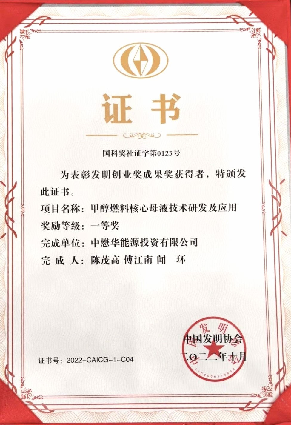 4月25日,由中國發(fā)明協(xié)會、科技日報(bào)社、國家科學(xué)技術(shù)獎勵工作辦公室、中國知識產(chǎn)權(quán)報(bào)社共同舉辦的第十七屆中國發(fā)明家論壇暨發(fā)明創(chuàng)業(yè)獎頒獎典禮在京舉行。第十屆全國人大常委會副委員長、中國關(guān)心下一代工作委員會主任顧秀蓮,科學(xué)技術(shù)部黨組成員、副部長,中國發(fā)明協(xié)會理事長吳朝暉,國家知識產(chǎn)權(quán)局專利局副局長王嵐?jié)阮I(lǐng)導(dǎo)出席為獲獎代表頒獎。會上由中懋華能源投資有限公司完成的“甲醇燃料核心母液技術(shù)研發(fā)及應(yīng)用”技術(shù)成果榮獲發(fā)明創(chuàng)業(yè)獎成果獎一等獎,中懋華能源投資有限公司董事長陳茂高作為獲獎代表出席頒獎典禮。