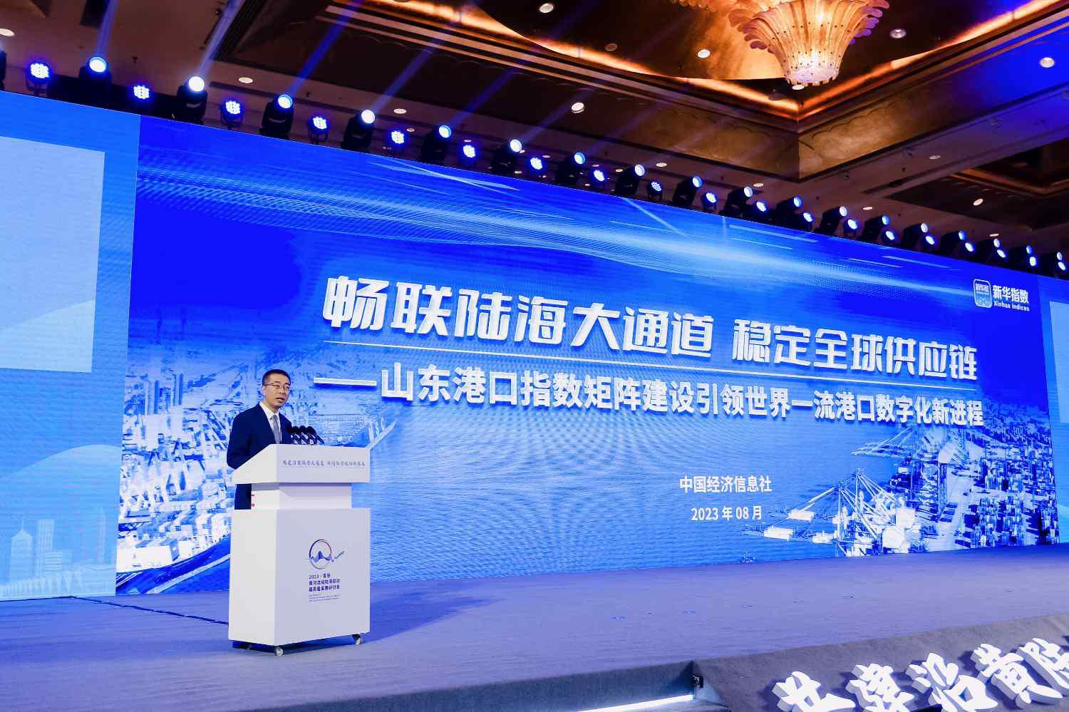 圖為中國經(jīng)濟信息社指數(shù)事業(yè)部主任曹占忠發(fā)布解讀《新華·山東港口大宗商品指數(shù)年度運行報告(2023)》。