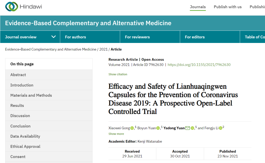 中成藥連花清瘟預(yù)防新冠肺炎研究取得重要進(jìn)展。近日,由中國河北醫(yī)科大學(xué)第二醫(yī)院呼吸與危重癥醫(yī)學(xué)科、武警河北總隊(duì)醫(yī)院醫(yī)學(xué)影像科共同撰寫的科研論文《連花清瘟膠囊預(yù)防新型冠狀病毒肺炎的有效性和安全性研究:前瞻性開放標(biāo)簽對(duì)照試驗(yàn)》于近日在國際期刊《循證補(bǔ)充和替代醫(yī)學(xué)》發(fā)表,揭示出連花清瘟在預(yù)防新冠感染中的作用,引發(fā)學(xué)界廣泛關(guān)注。