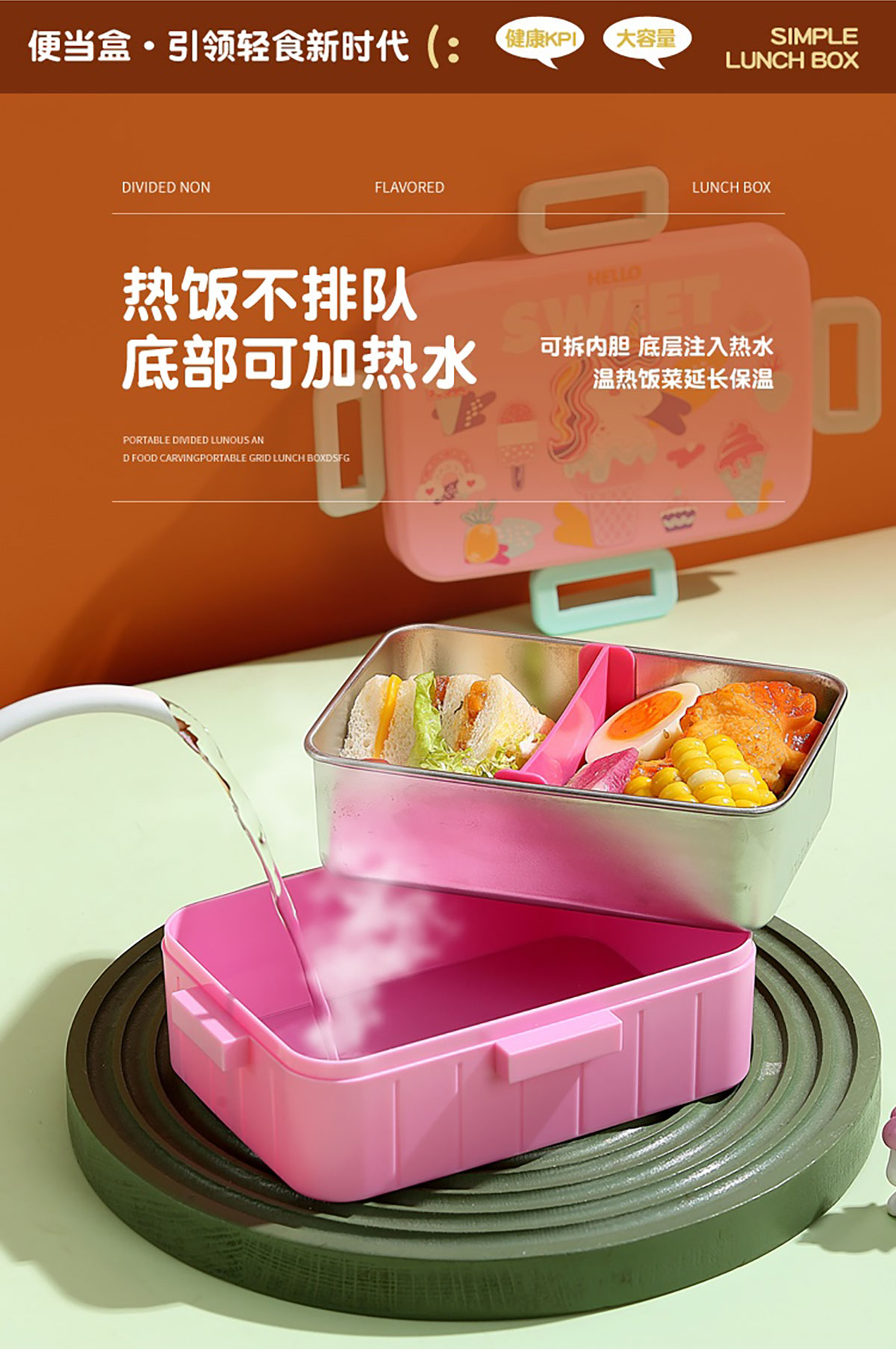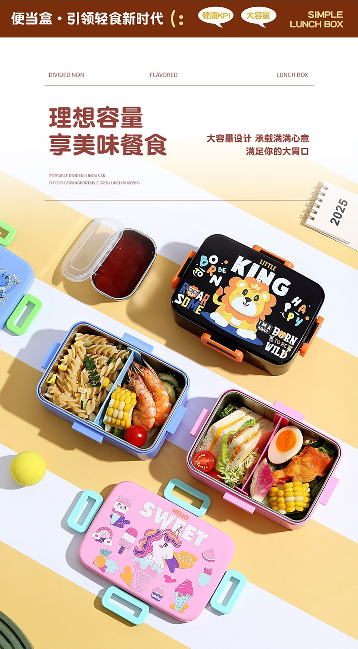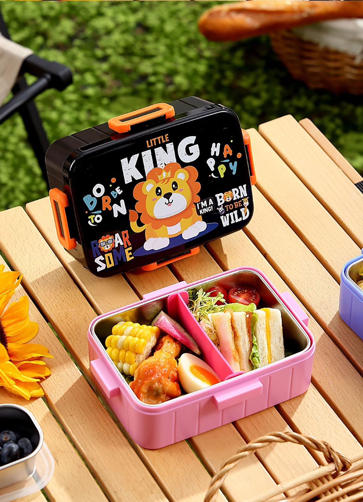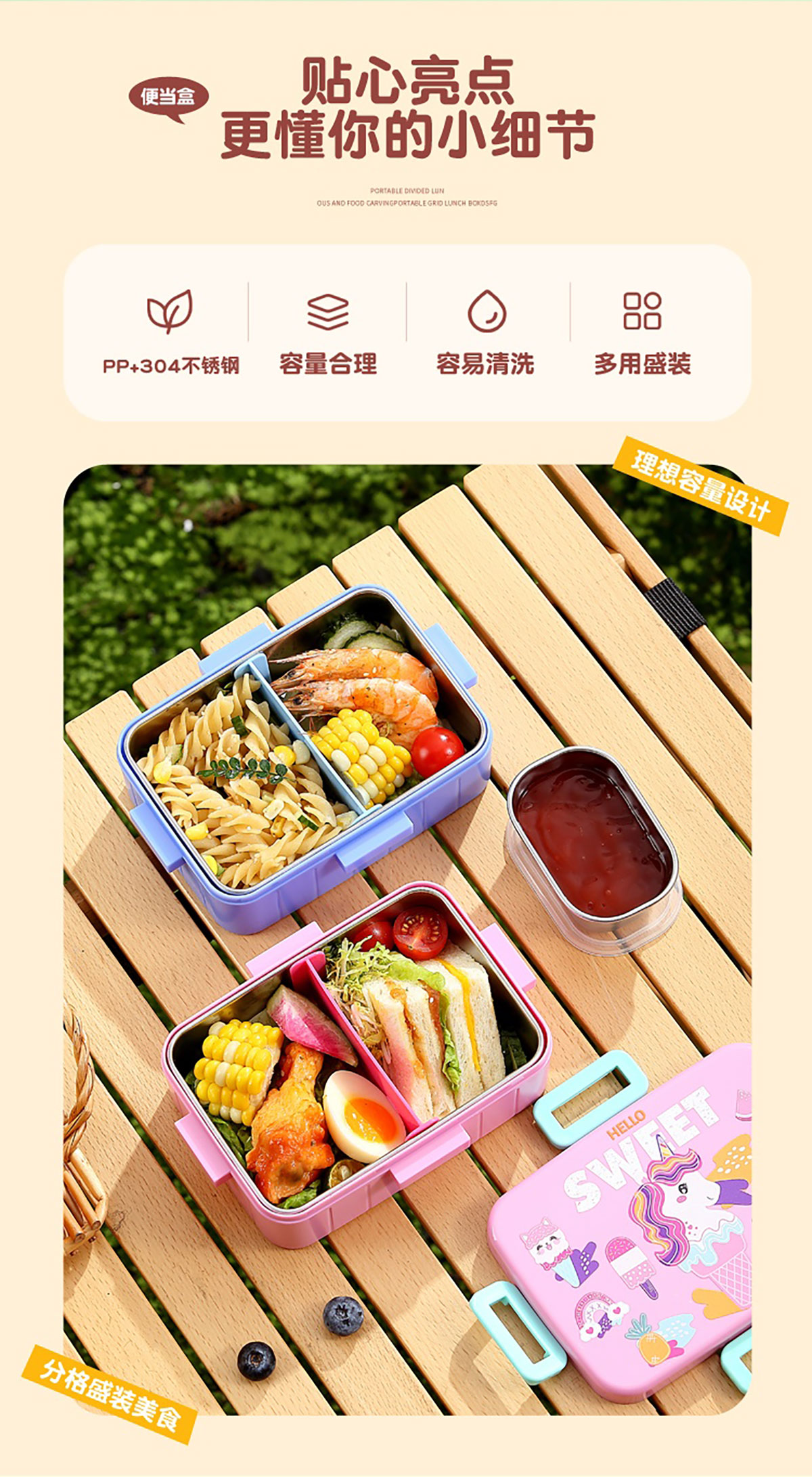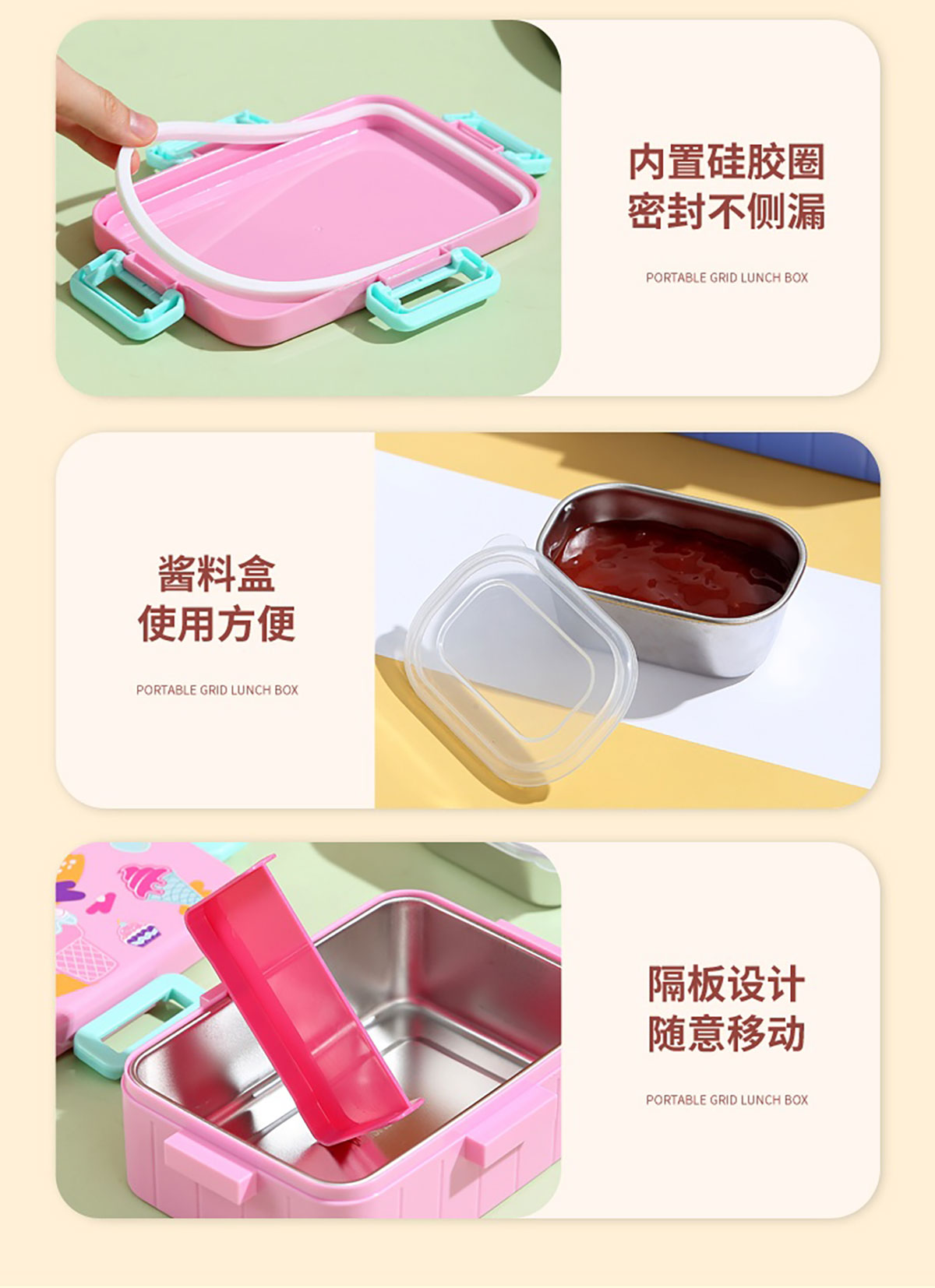 卡通方扣不銹鋼餐盒600ml+隔板/600ml+隔板+不銹鋼碗100ml+隔板