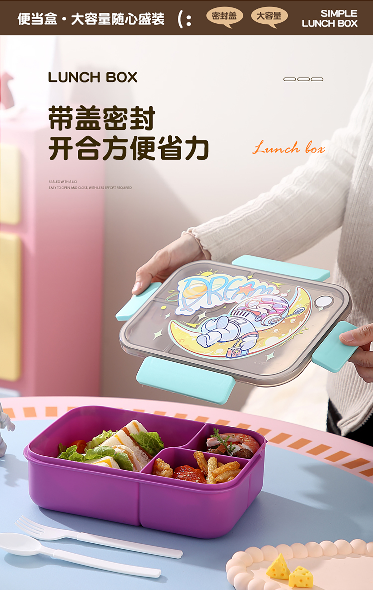 卡通透明蓋分格飯盒1450ml